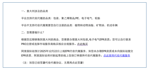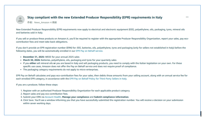 近期,你能否也收到了平台关于意大利EPR(出产者义务延长)合规的告急通知?这并非例行提示,而是一道必需施行的“合规deadline”。亚马逊取阿里巴巴国际坐已同步步履,正式将意大利EPR合规提上强制日程。这意味着,发卖相关品类的卖家,若未正在时限前自从完成合规,将面对平台从动代扣代缴费用的场合排场,店肆风险也突然升高。