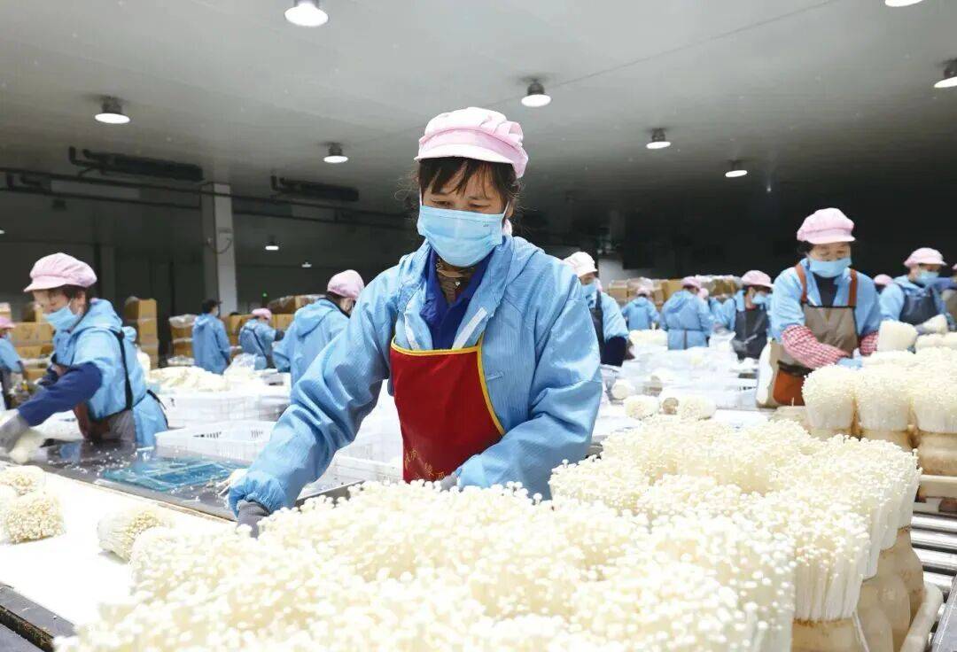 铜陵国度农业科技园区内的安徽康恒生物科技无限公司出产车间,工人们正在流水线采收金针菇供应市场。 潘伟 梅建广 摄。